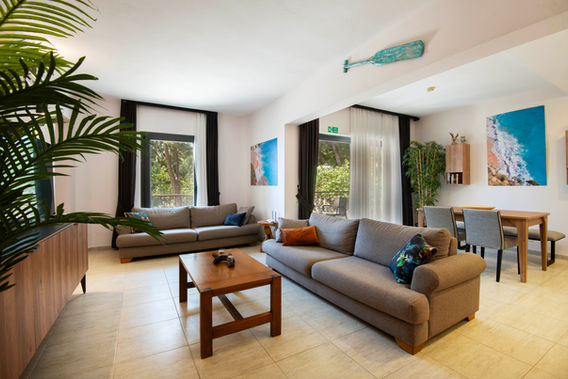 The open-plan living area at Caretta Mare combines stylish design with comfort and functionality. Bright interiors, a cozy sofa, and a modern, fully equipped kitchen create a welcoming space, perfect for relaxing.